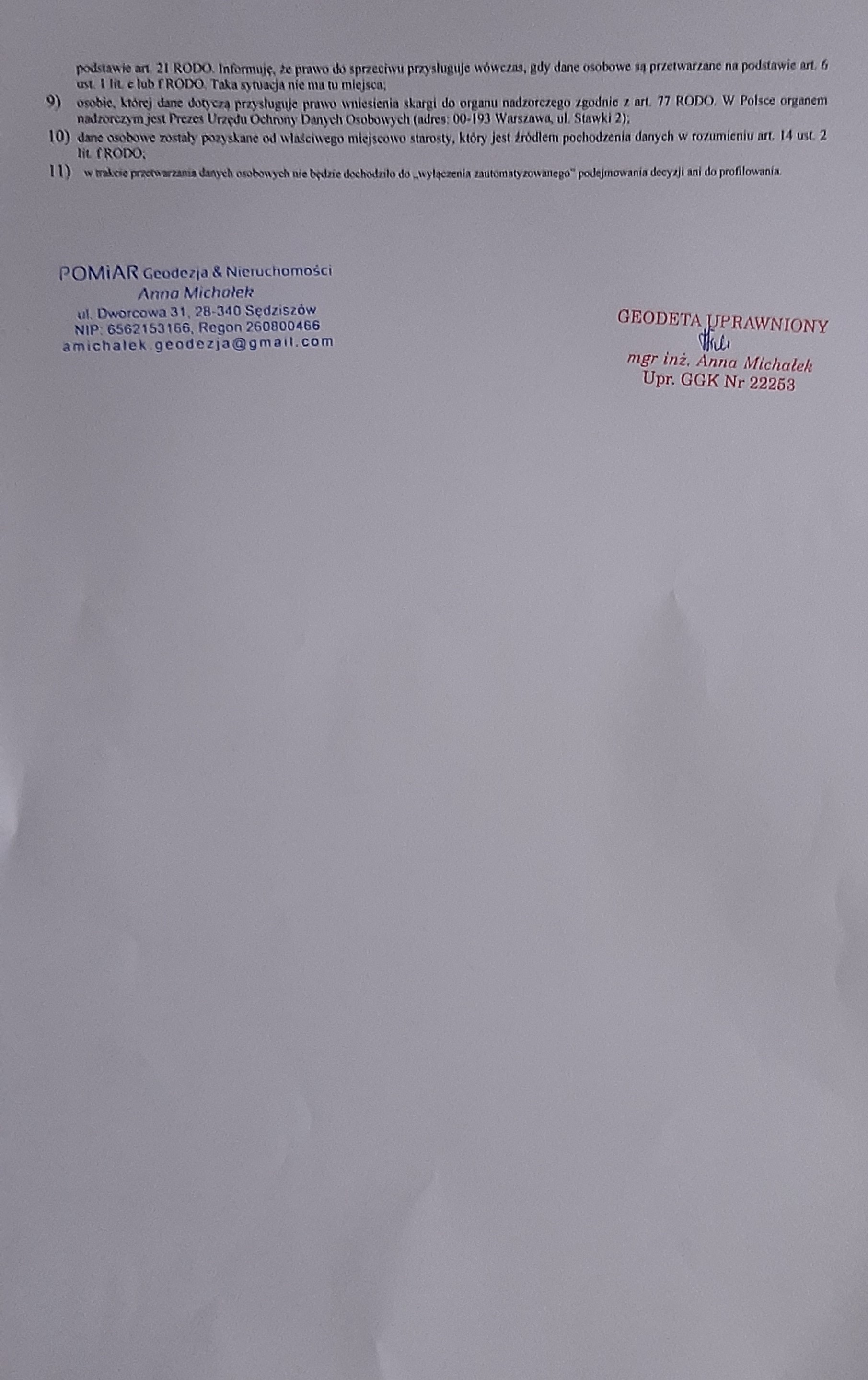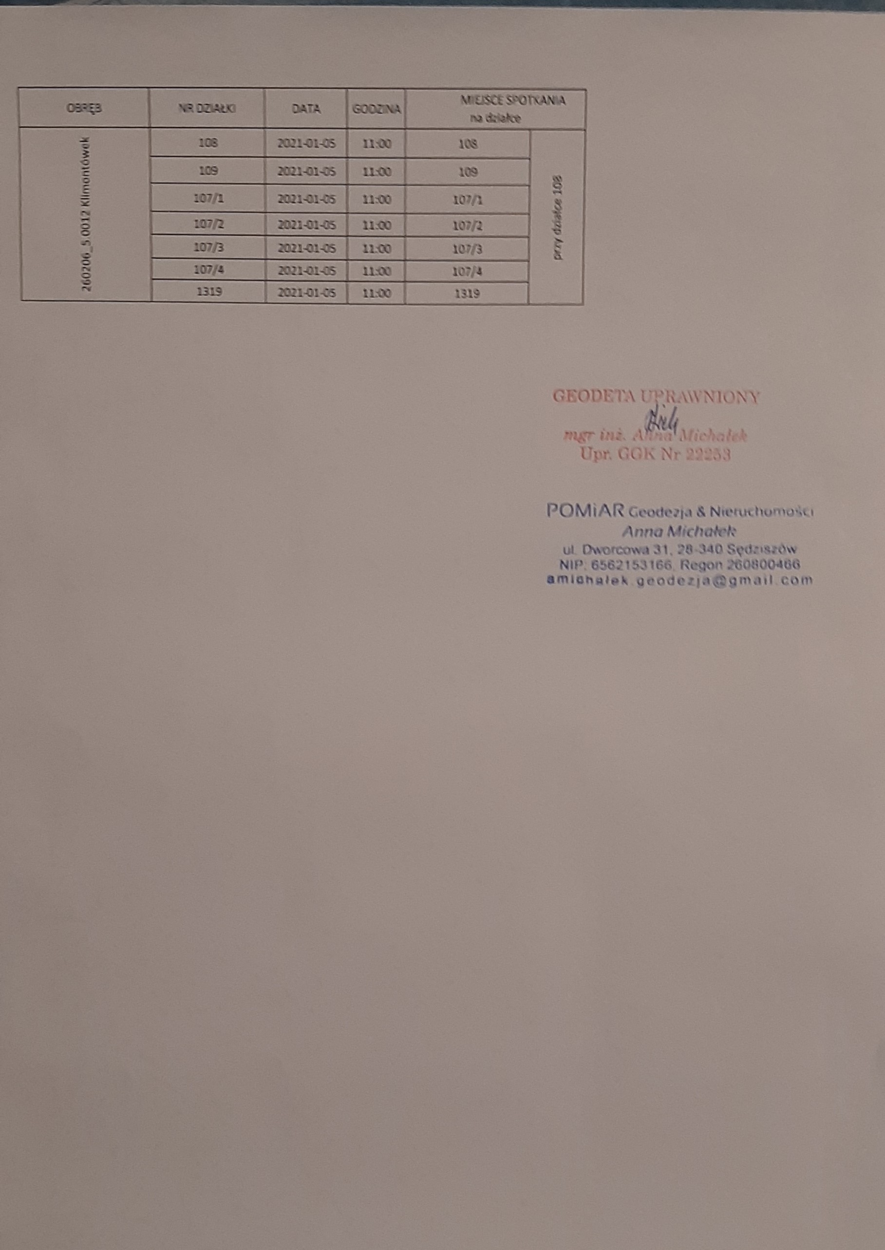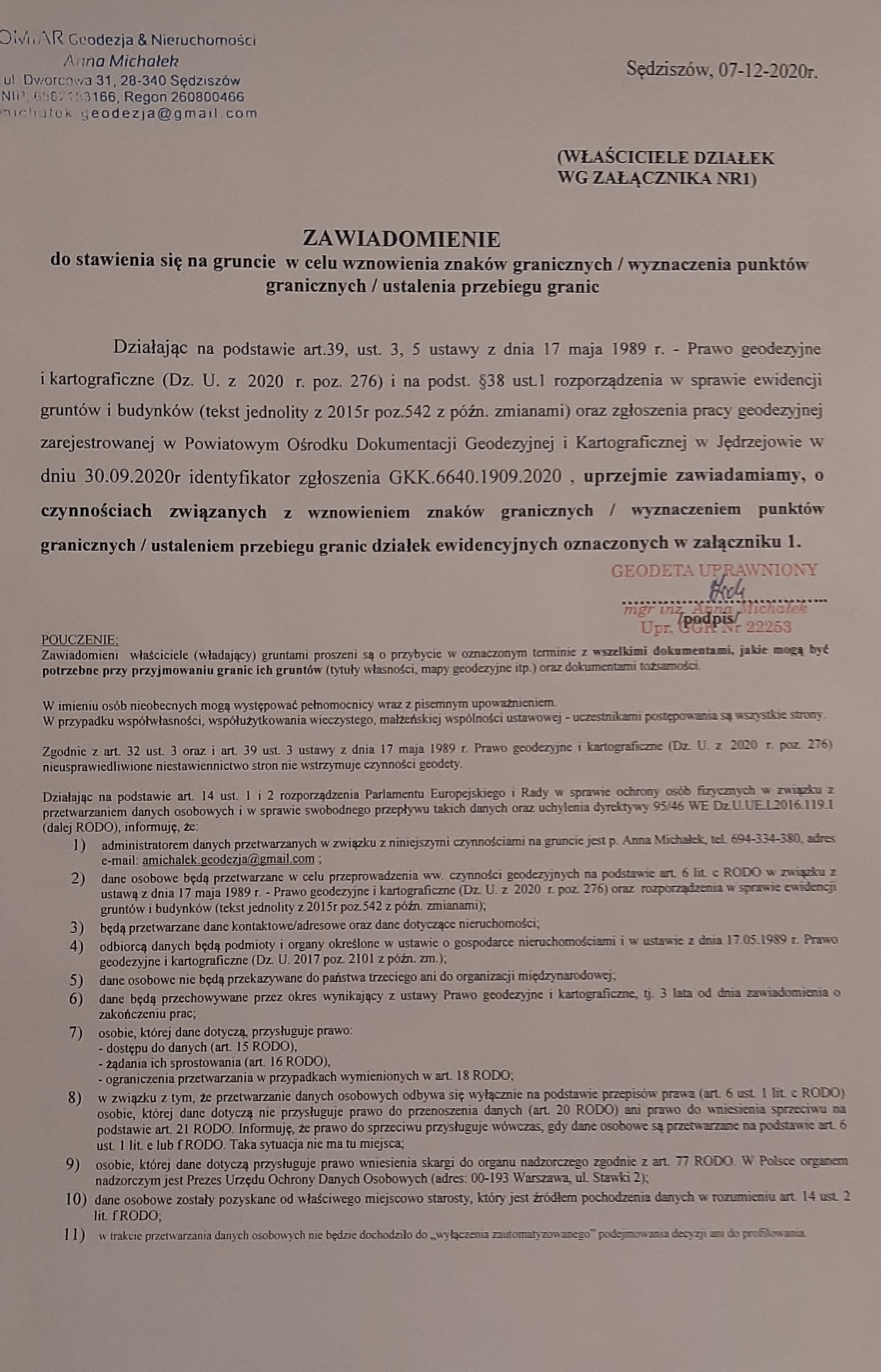 ZAWIADOMIENIE o czynnościach wznowienia znaków granicznych / wyznaczenia punktów granicznych / ustalenia przebiegu granic działek ewidencyjnych wymienionych w załączniku z działkami sąsiednimi położonymi w obrębie Klimontówek, gm. Sędziszów