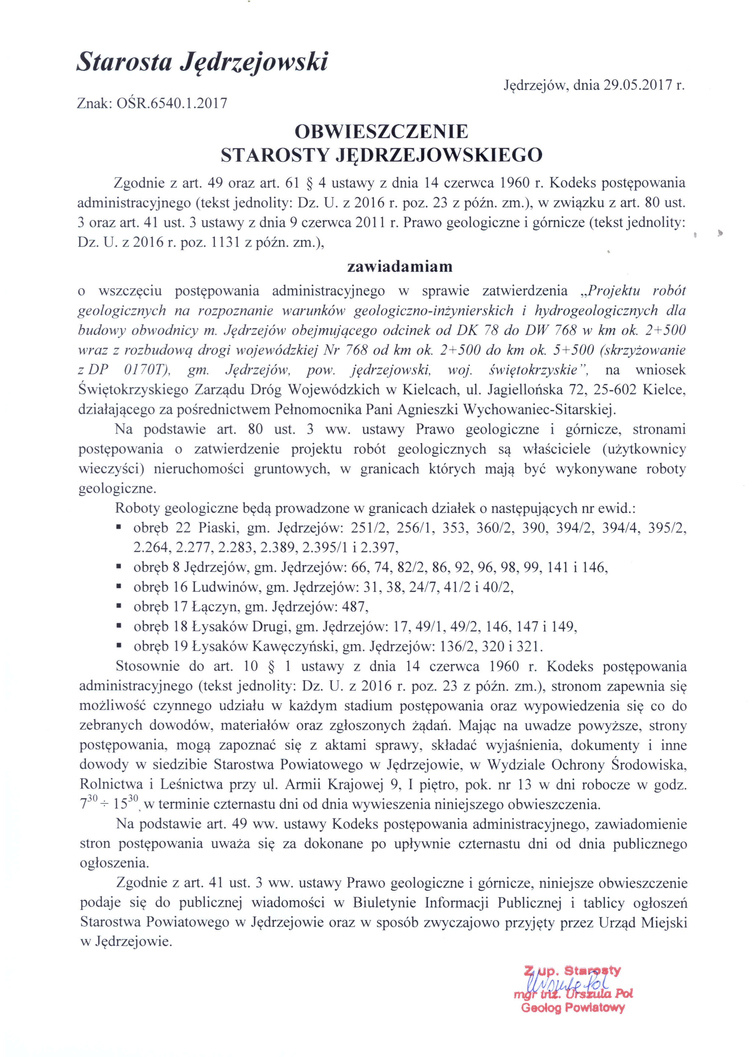 Zgodnie z art. 95 ust. 3 ustawy z dnia 3 października 2008 r. - o udostępnieniu informacji o środowisku i jego ochronie, udziale społeczeństwa w ochronie środowiska oraz o ocenach oddziaływania na środowisko (tekst jedn. Dz. U. z 2016 r. poz. 353 z późn. zm.) Starosta Jędrzejowski zawiadamia, że w dniu 11.05.2017 r. wydana została decyzja Nr 192/2017 o zatwierdzeniu projektu budowlanego i udzieleniu pozwolenia na rozbudowę instalacji do produkcji wapiennych wyrobów drobnoziarnistych wraz z instalacjami: elektryczną i technologiczną, na działkach oznaczonych numerami ewidencyjnymi: 225/3, 225/4, 223, 226, 227/1, 227/2, położonych w miejscowości Wierzbica, gmina Sobków.